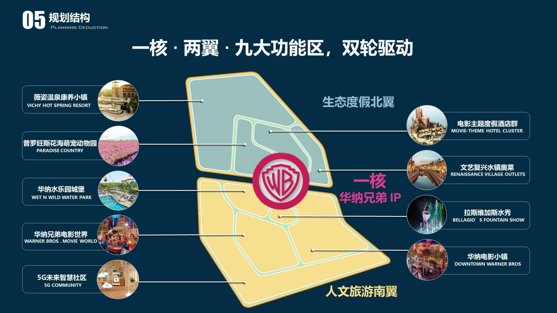 该度假区定位为全球第五家、中国首家华纳兄弟电影世界,将上映华纳兄弟旗下多部热门影视作品,并引进享誉世界的莫斯科国家大马戏团,呈现最高水准的马戏表演。该度假区将填补中国西部地区对重量级文化旅游品牌的需求空白,形成强大的区域旅游吸引力。